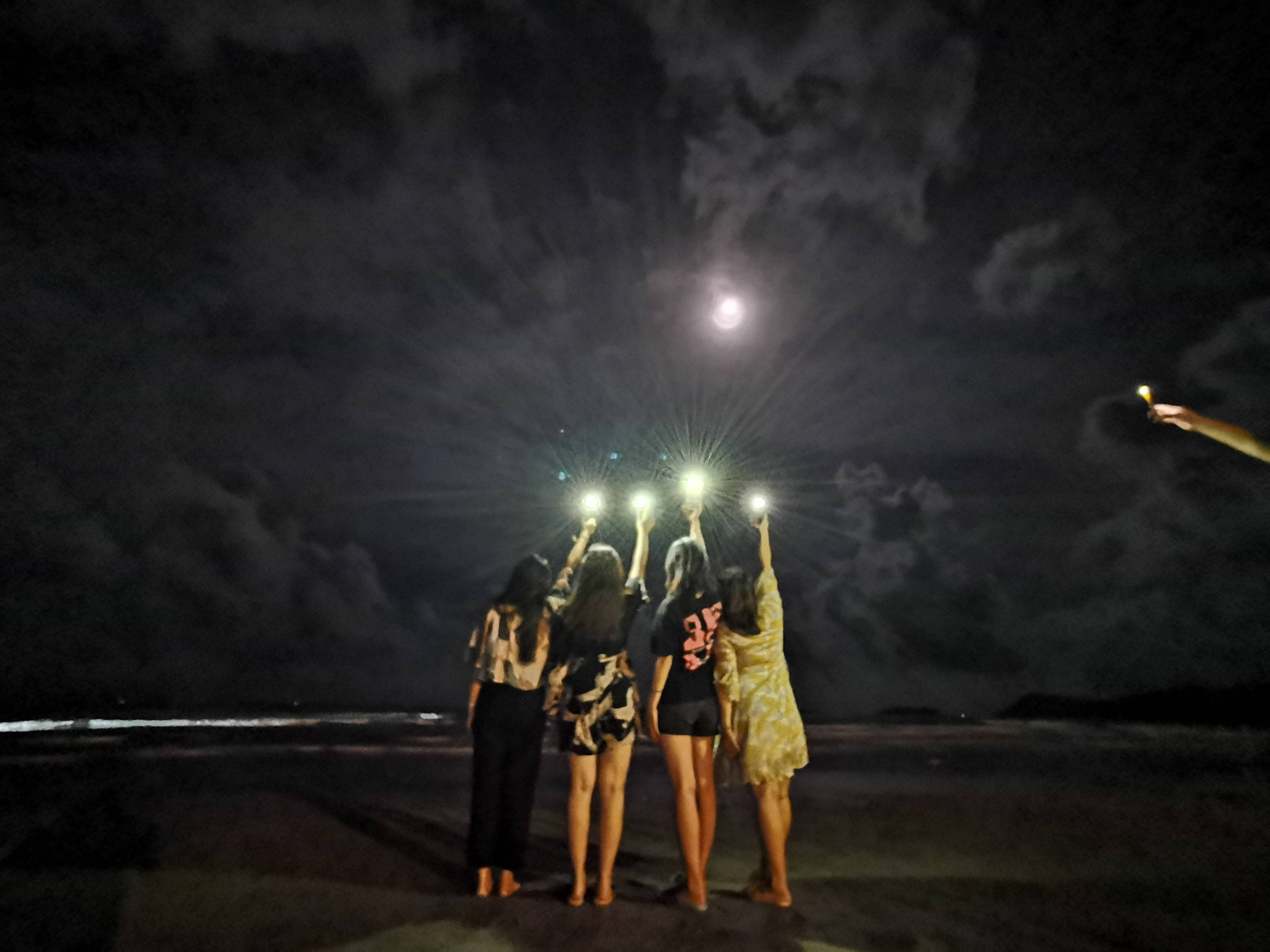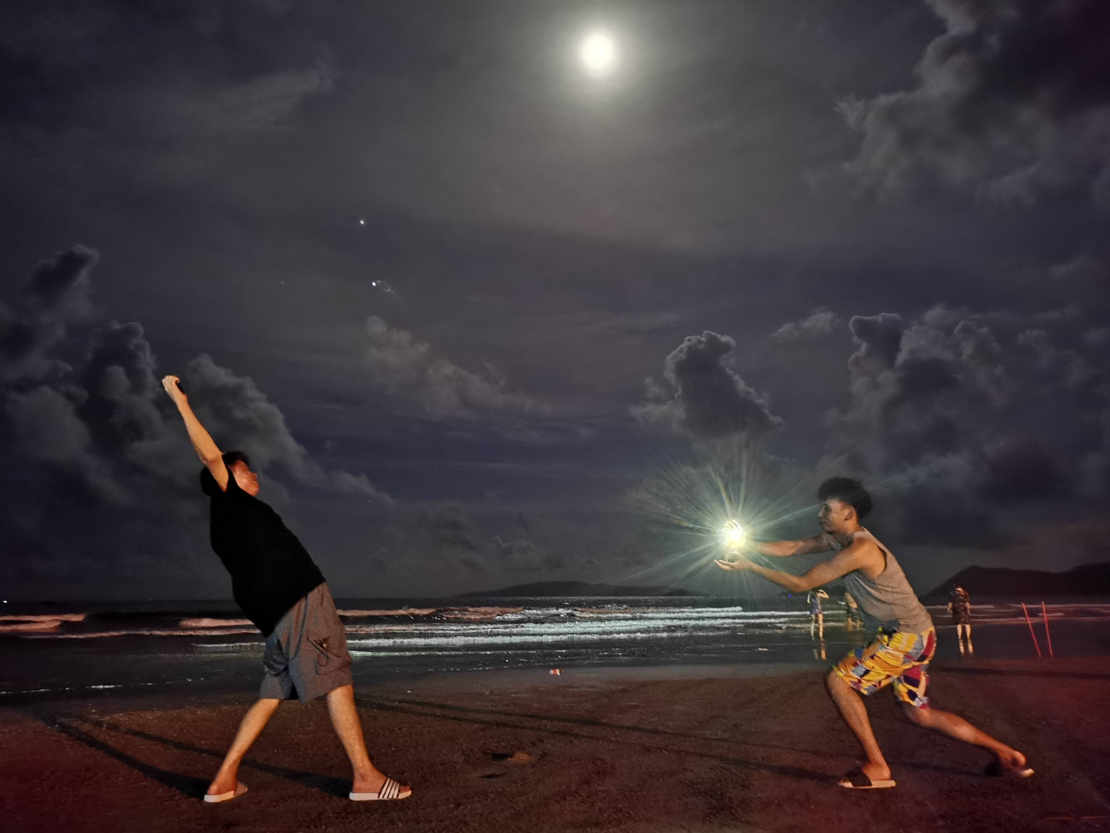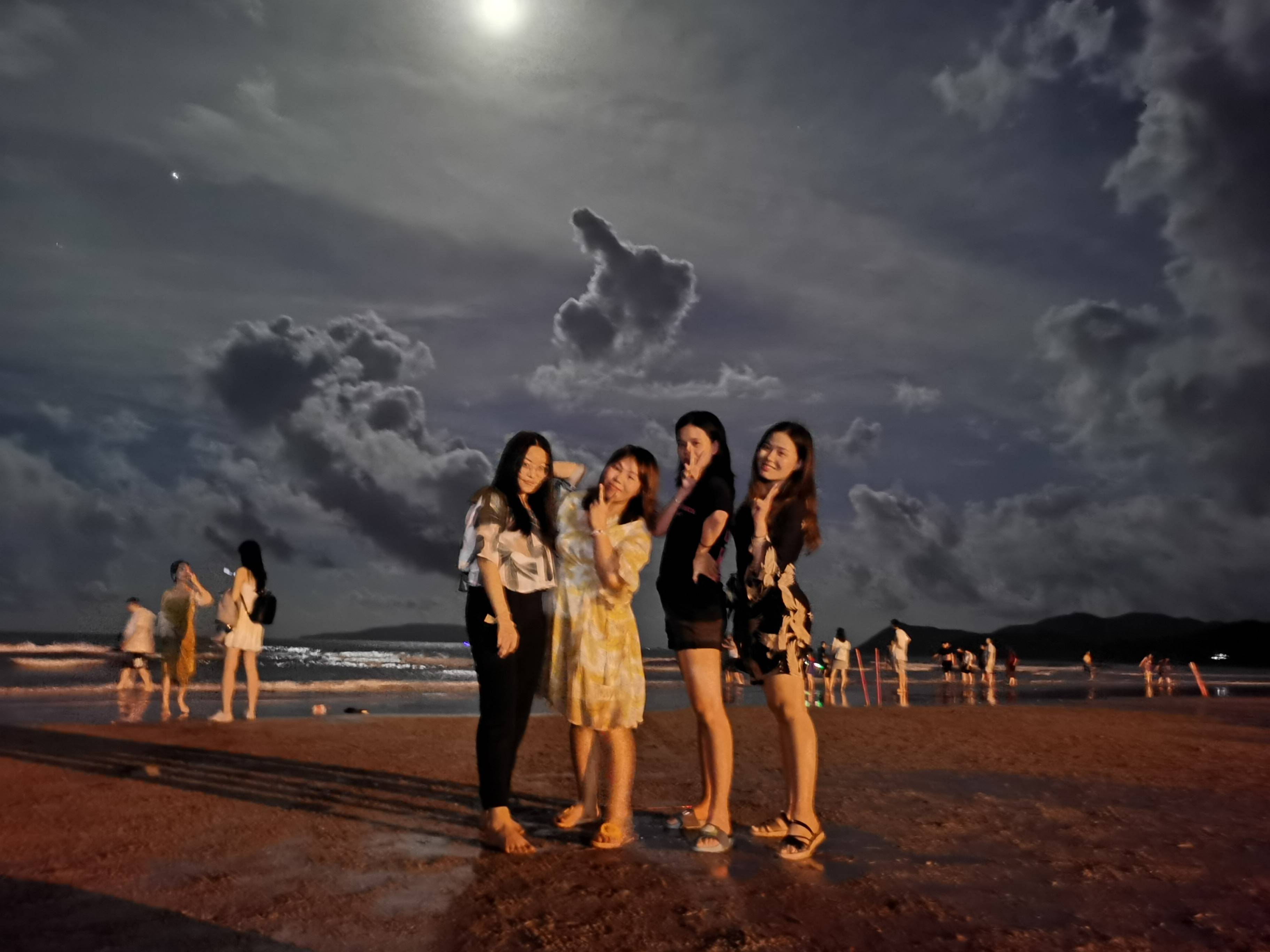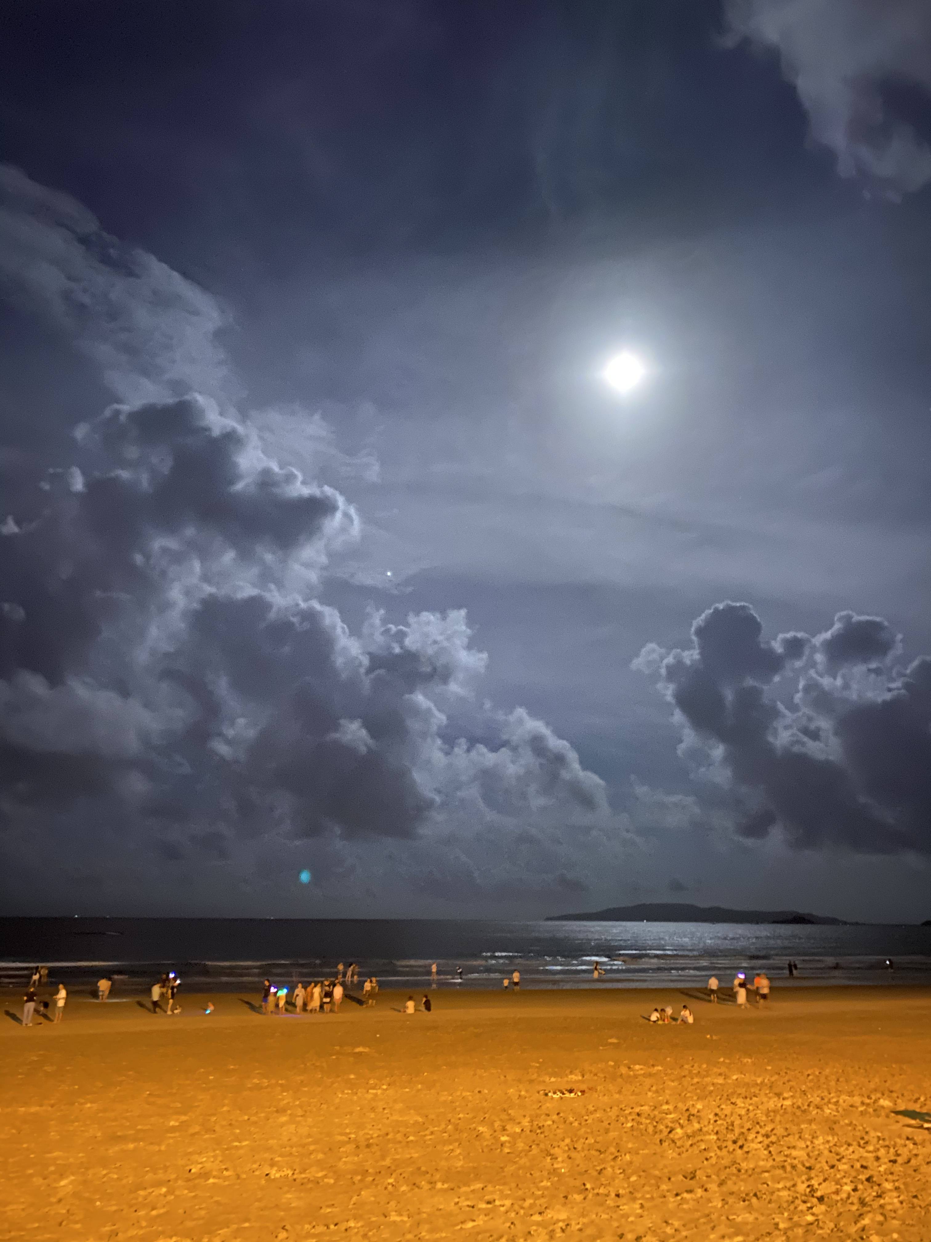 人们不会因为天色已晚而散去,因为夜晚的沙滩别有一番风味,皎洁的月光洒在海面上,看到的是波光粼粼!