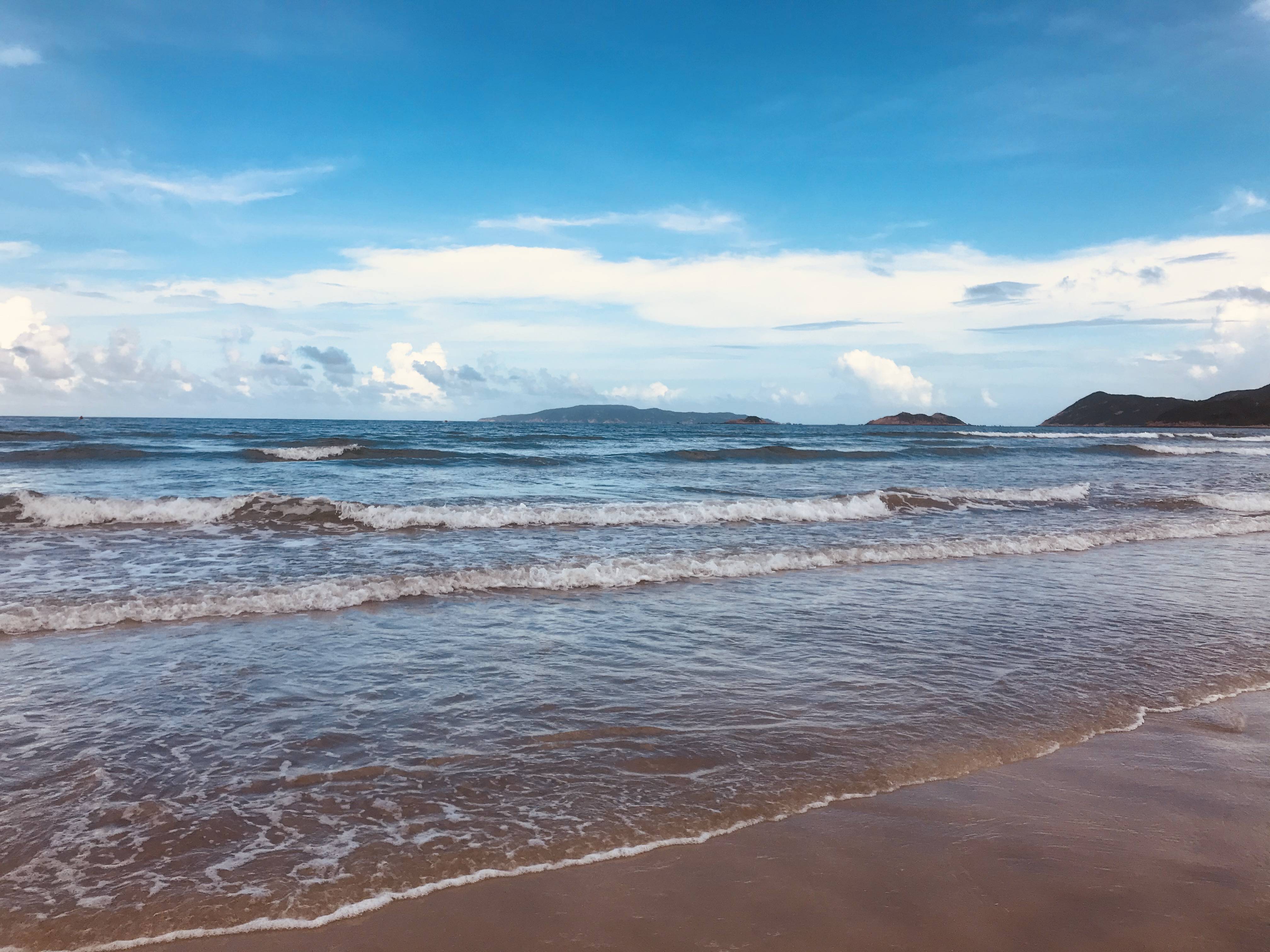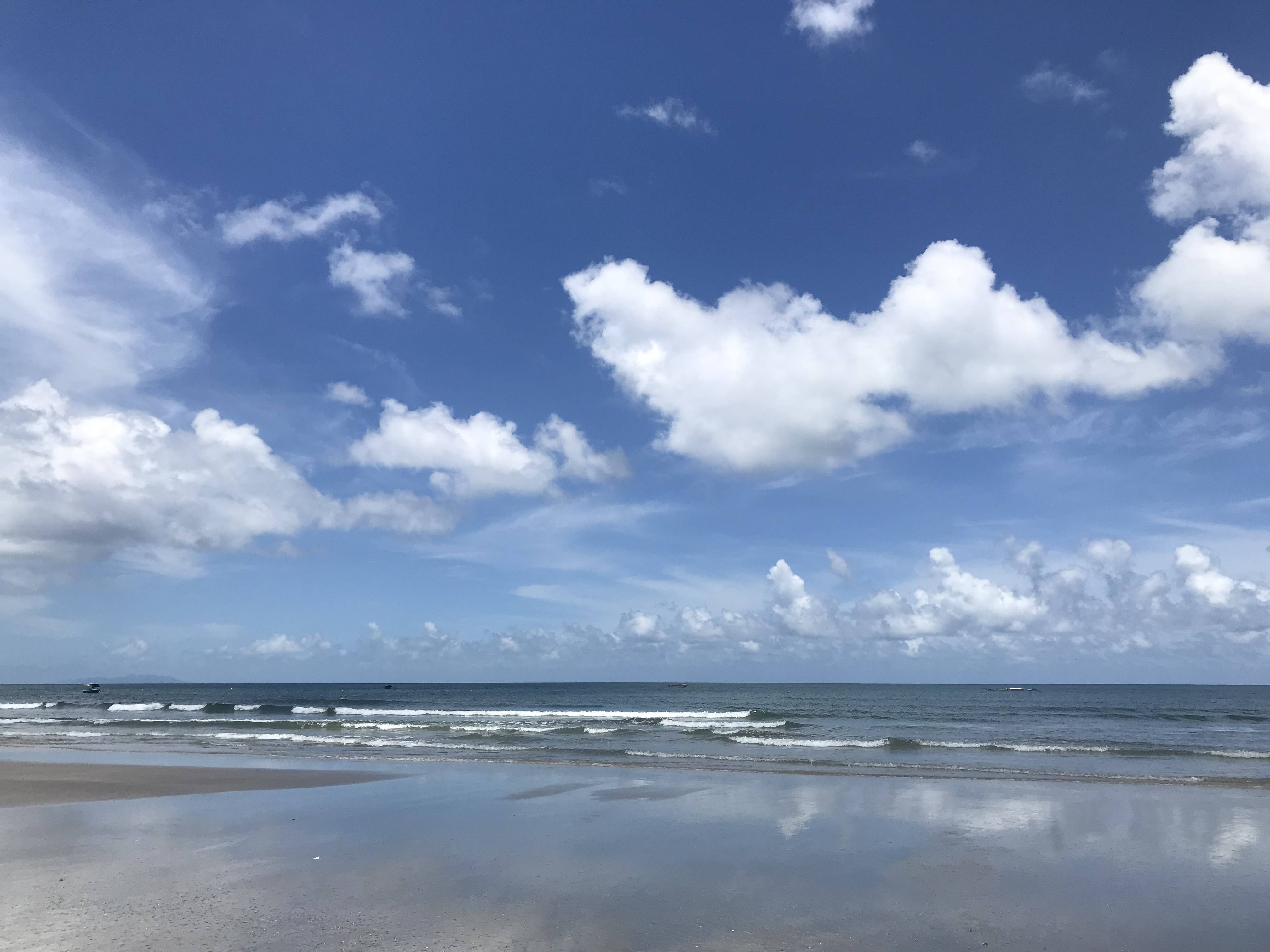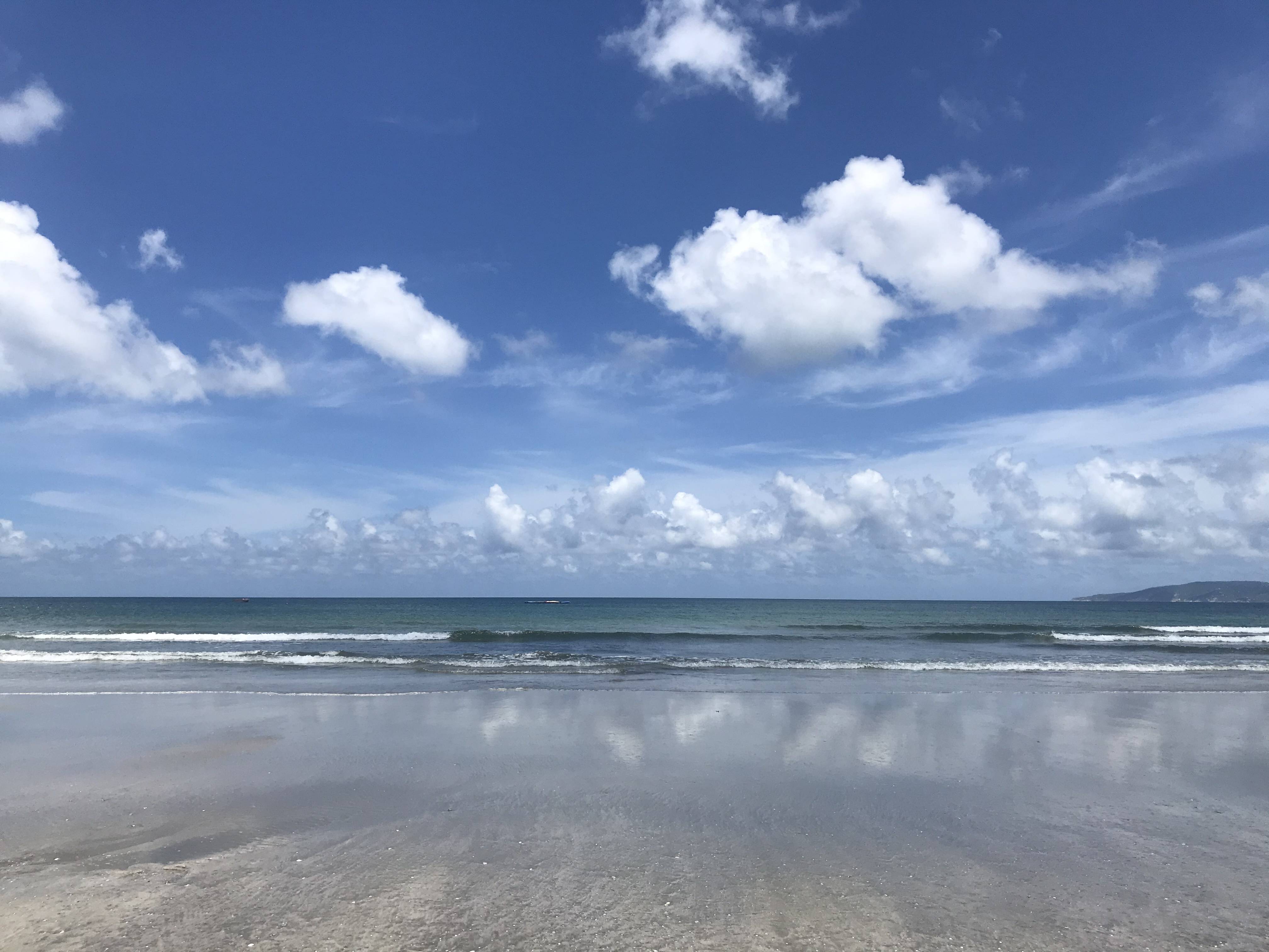 就在这刚刚好的阳光下,清澈见底的海水泛起一层层洁白的浪花,蔚蓝深邃的天空伴着一朵朵悠闲的白云,绵绵无期的沙滩倒映着蓝天白云宛如天空之境,令人着迷!