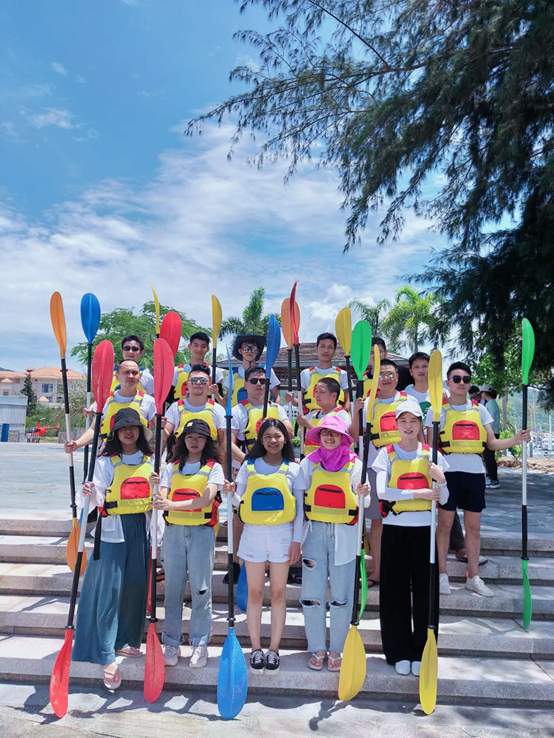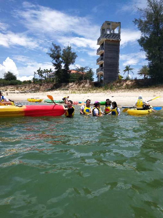 伴随着大家的欢笑声和蓝天白云的美景中,我们开心的荡起了双桨,奋力的在大海上划开一波又一波的波浪,左划、右划,还有小组翻船啦,哈哈··翻了船的同事喝了一口咸咸的海水,因为穿着救生衣浮起来了,然后又回到船上,继续我们的皮划艇比赛,友谊第一,比赛第二,看看谁划的快;