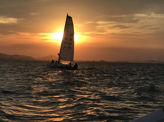 落日余晖之下,我们的帆船大部队出发了,海面上错落有致的分布着我们的小伙伴乘坐的帆船,是不是有种乘风破浪会有时,直挂云帆济沧海的感觉;