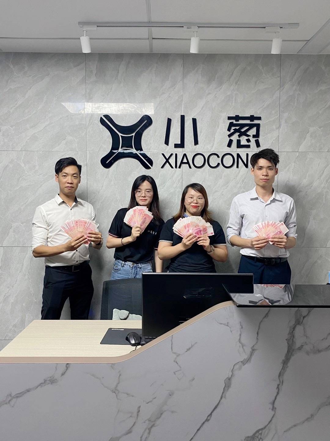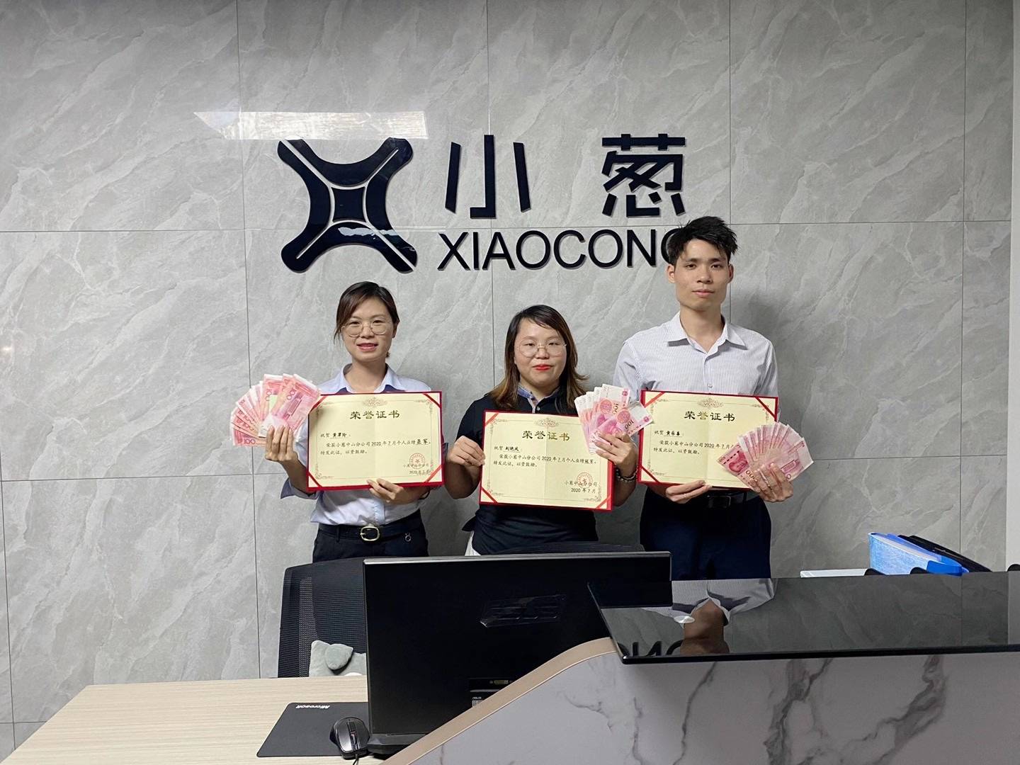 中山分公司业绩前三的精英们手捧荣誉证书,奖金更是令人羡慕