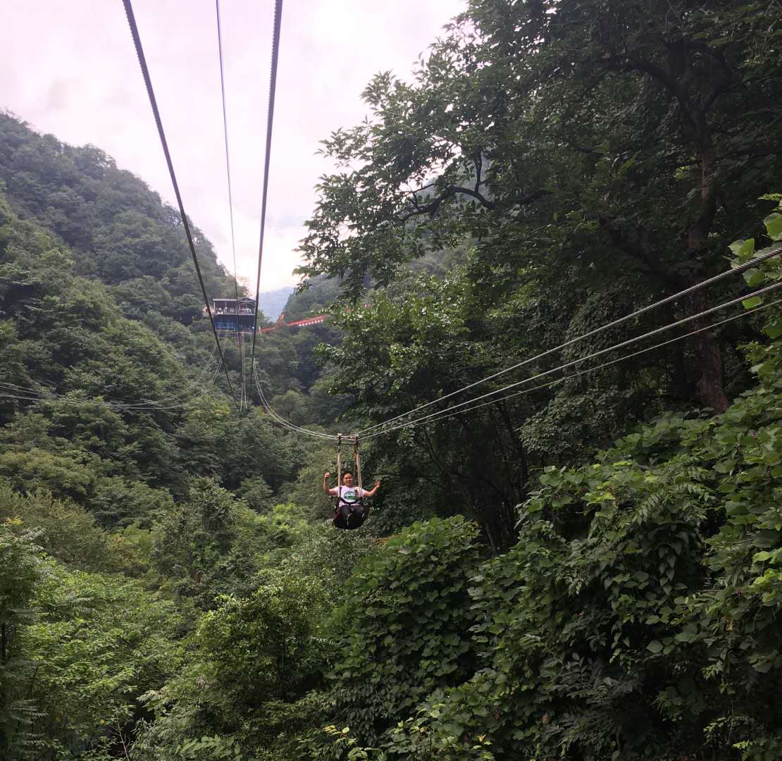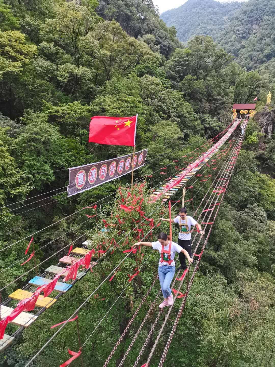 山顶的四分之三处,就到了重渡沟网红桥处,大家商议着要挑战一下这个刺激的项目,来一场空中走秀。